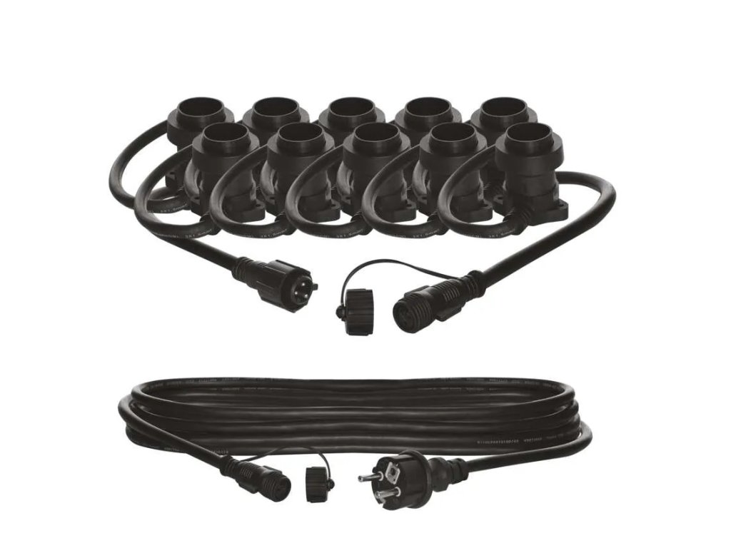 Startovací sada světelného řetězu obsahuje světelný řetěz a přívodní kabel pro připojení do elektrické zásuvky. Řetěz je vybaven paticemi E27, do kterých můžete umístit žárovky libovolné barvy, tvaru a příkonu až do maximální hodnoty 750 W. Pouhou výměnou žárovek můžete doladit útulnou atmosféru na balkoně, terase, venkovních oslavách, svatbách, kulturních akcích apod. Propojení přívodního kabelu s řetězem nebo více přikoupenými řetězy je dílem okamžiku díky vodotěsných šroubovacím spojkám. Řetěz hravě zvládne i nepřízeň počasí – žárovková objímka je vybavena gumovým těsněním, které přilne k instalované žárovce po celém jejím obvodu a zabraňuje tak průniku vody.