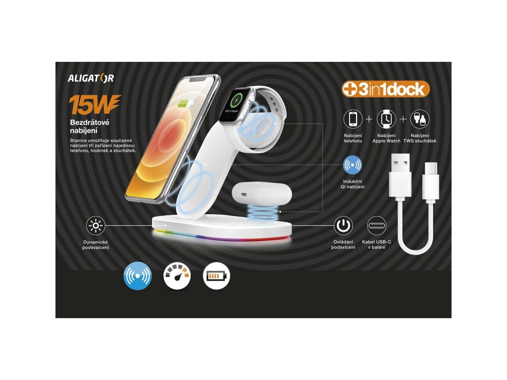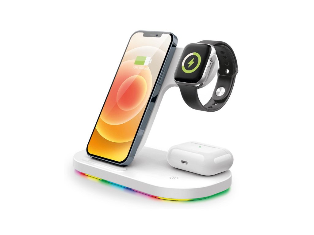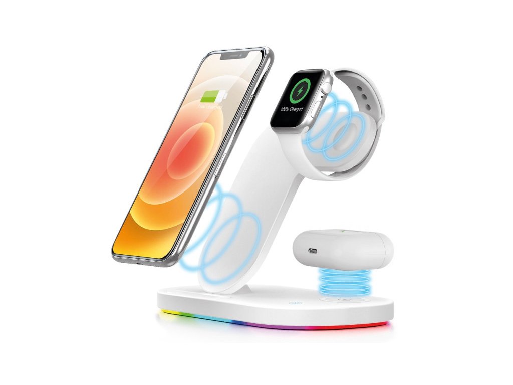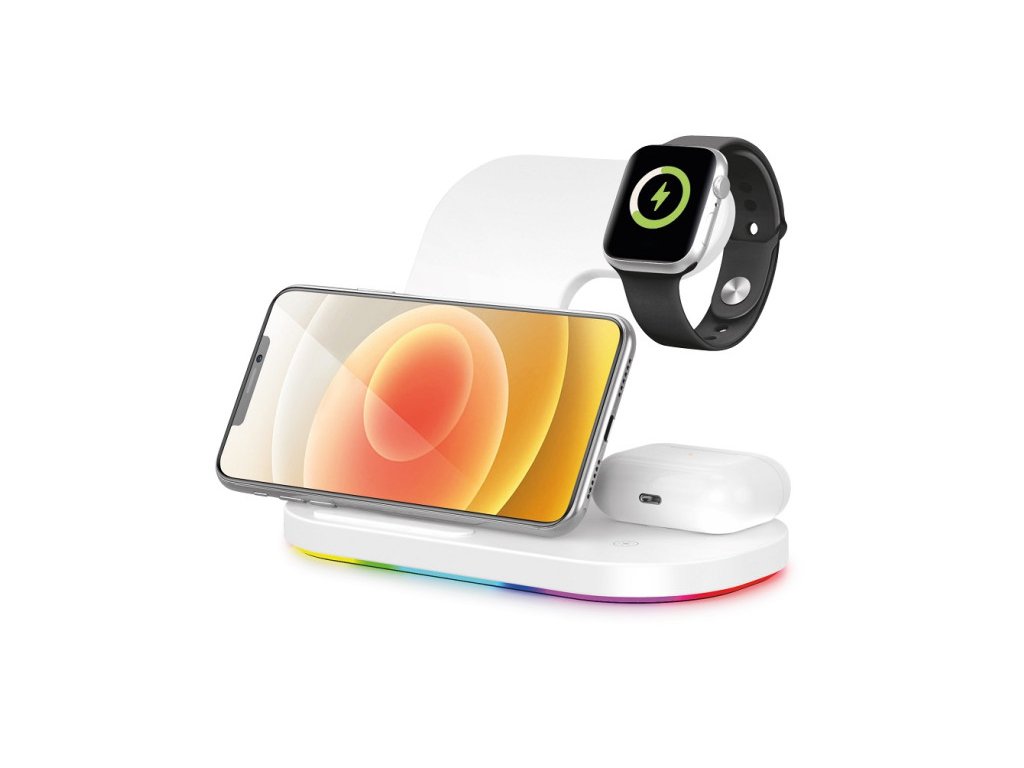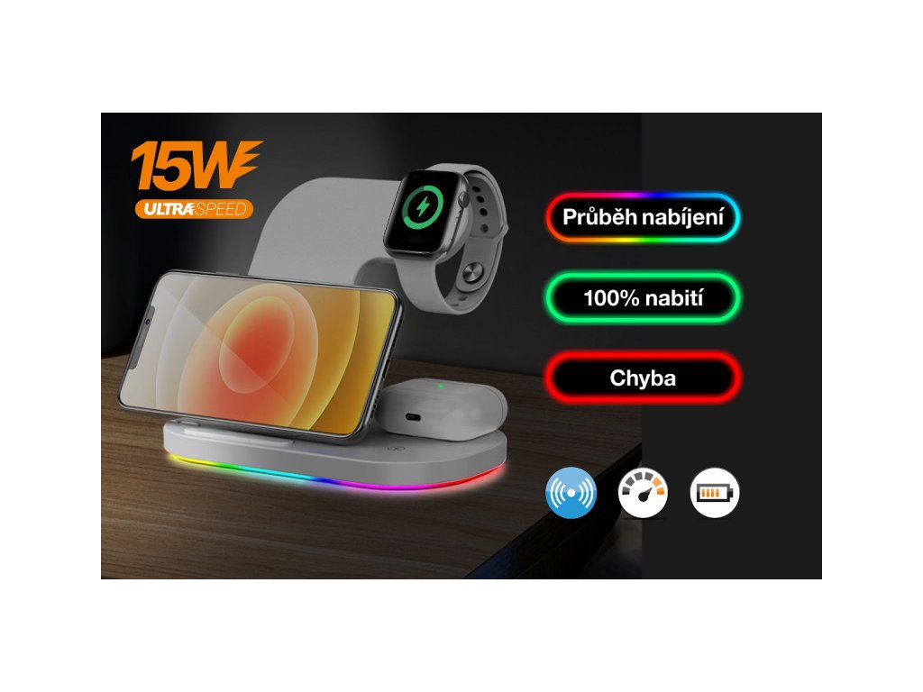 Bezdrátová stanice s podporou rychlého bezdrátového nabíjení o výkonu 15W. Hravě a bezdrátově nabije Váš mobilní telefon, TWS sluchátka a hodinky Apple Watch – a to všechno najednou!